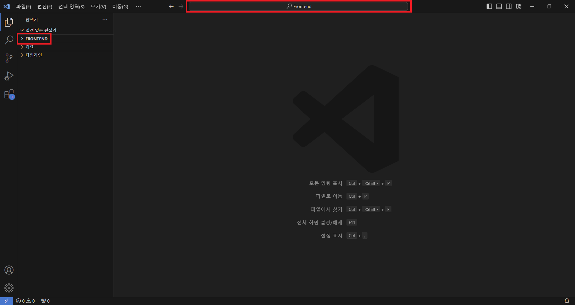 VSCode 재시작하면 한글 언어팩이 적용된 것을 확인할 수 있다.