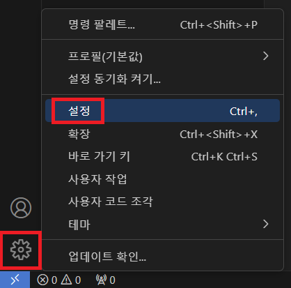 좌측 하단 [관리]에 [설정]을 클릭한다. (단축키: Ctrl + ,)