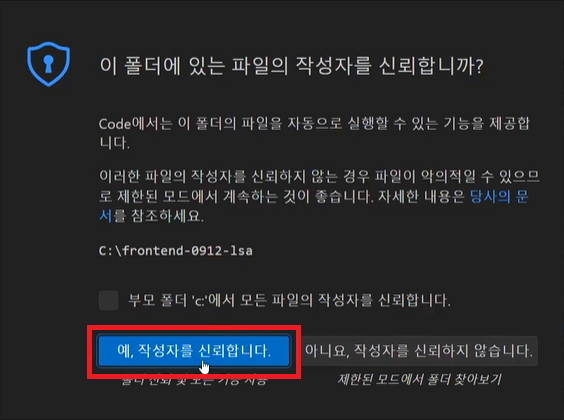 폴더 선택 후 팝업 메시지가 뜨면, [예, 작성자를 신뢰합니다.] 클릭한다.