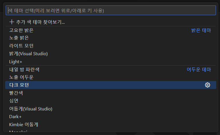 기본으로 "다크 모던" 테마가 적용되어 있다.