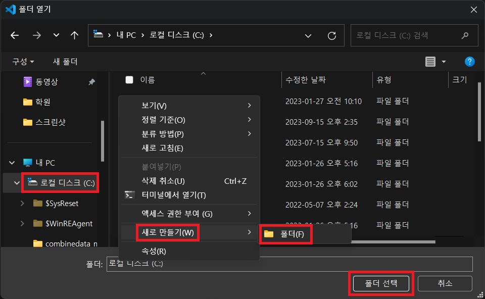 C 드라이브로 이동 → [새로 만들기(W)] 클릭 → [폴더(F)] 클릭