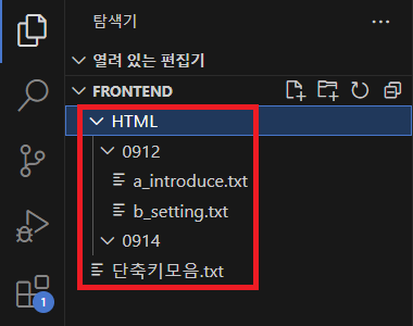 "HTML"과 "0912", "0914"는 새 폴더로 생성했고 ". txt"는 새 파일로 생성했다.